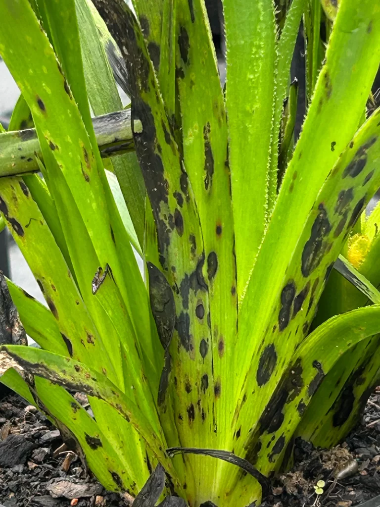 Ink Disease is a fungal infection that affects the leaves and flower stems of Kangaroo Paw. It’s usually caused by a fungus called Alternaria alternata, though other fungi can get involved too. It shows up as dark purple or black blotches that look like splashes of ink – hence the name.